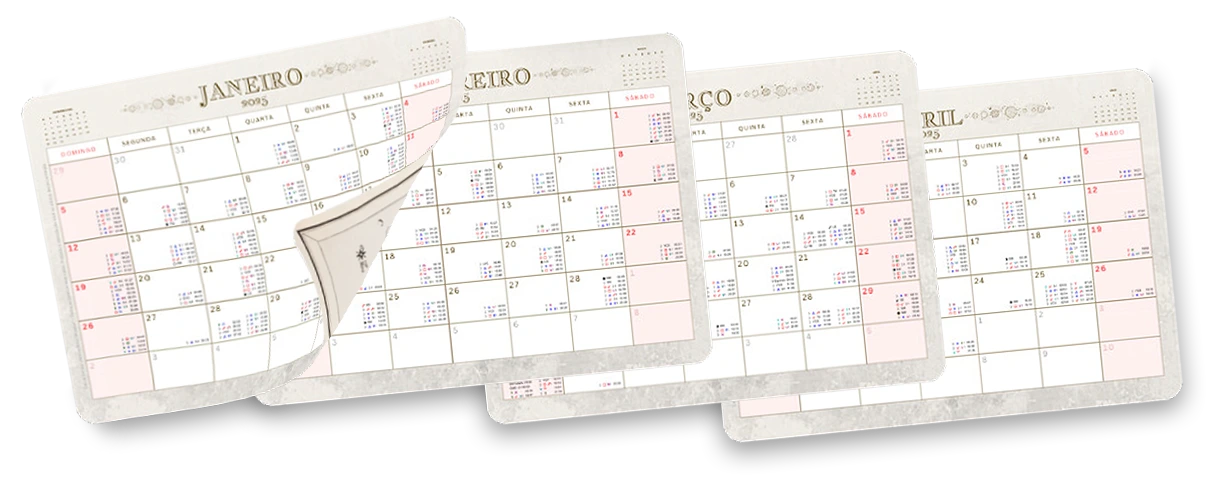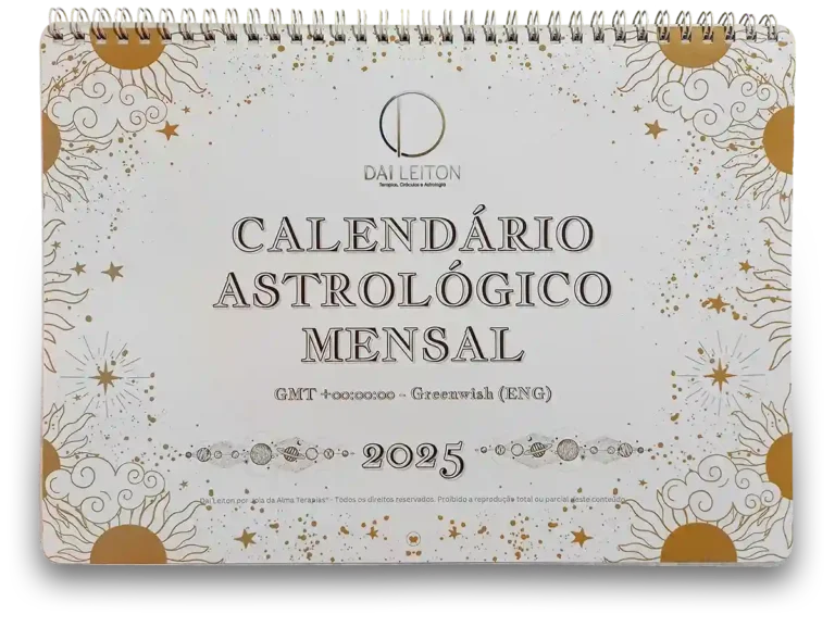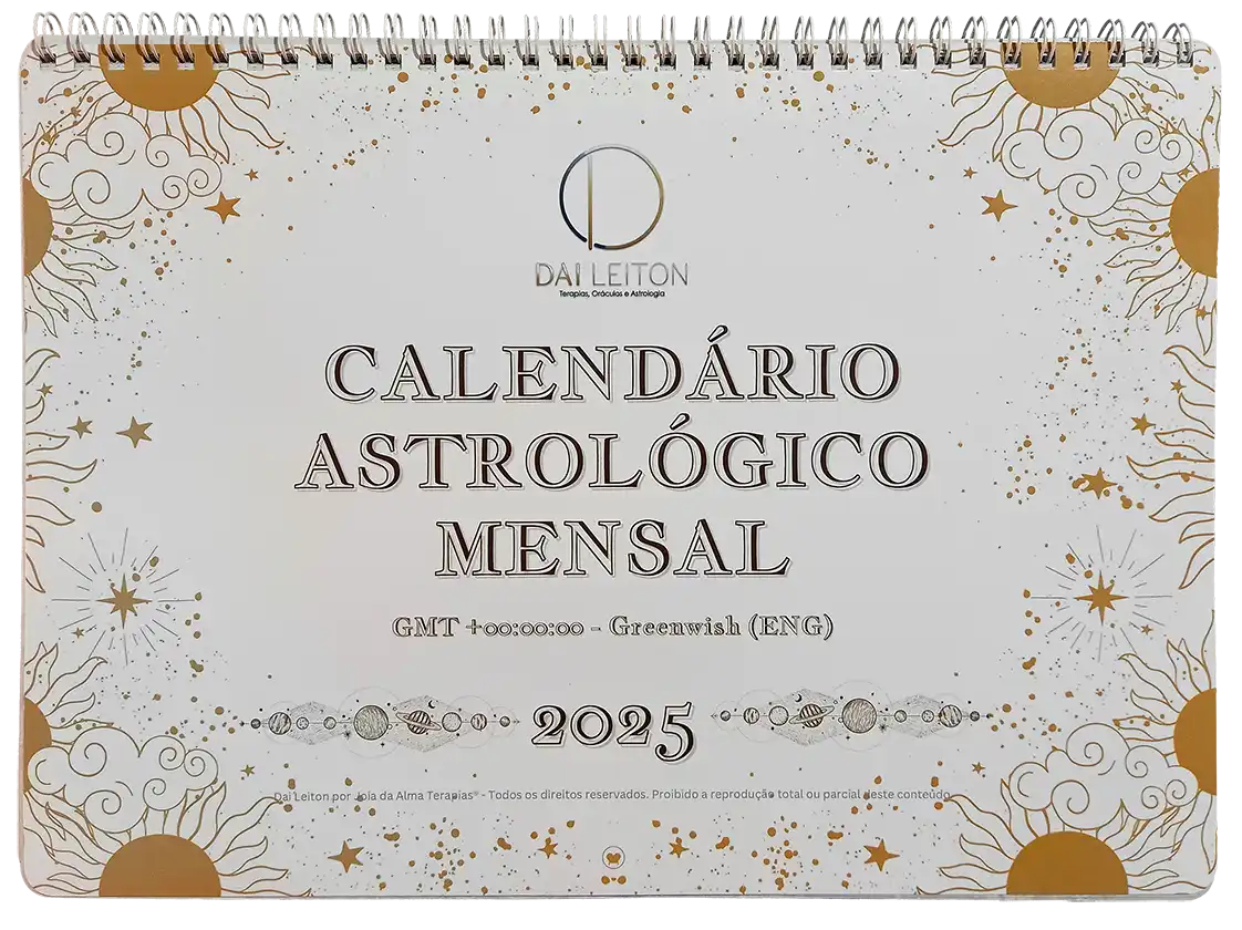 O Calendário Mensal Astrológico (por Dai Leiton) vem trazendo todos os movimentos astrológicos previstos para o ano de 2025. Formatado em linguagem astrológica, seu intuito é ajudar você a se planejar e acompanhar as movimentações astrológicas durante todo o ano.